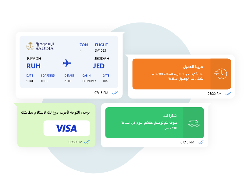 استخدام واتس لووب لإنشاء تنبيهات تفاعلية تحتوي على الصور والملفات والفيديو والإحداثيات كما يمكنك استخدامها في اصدار الفواتير أو تتبع الشحنات أوارسال التذاكر الإلكترونية بالإضافة لأرسال التنبيهات المالية والمستحقات الشهرية.